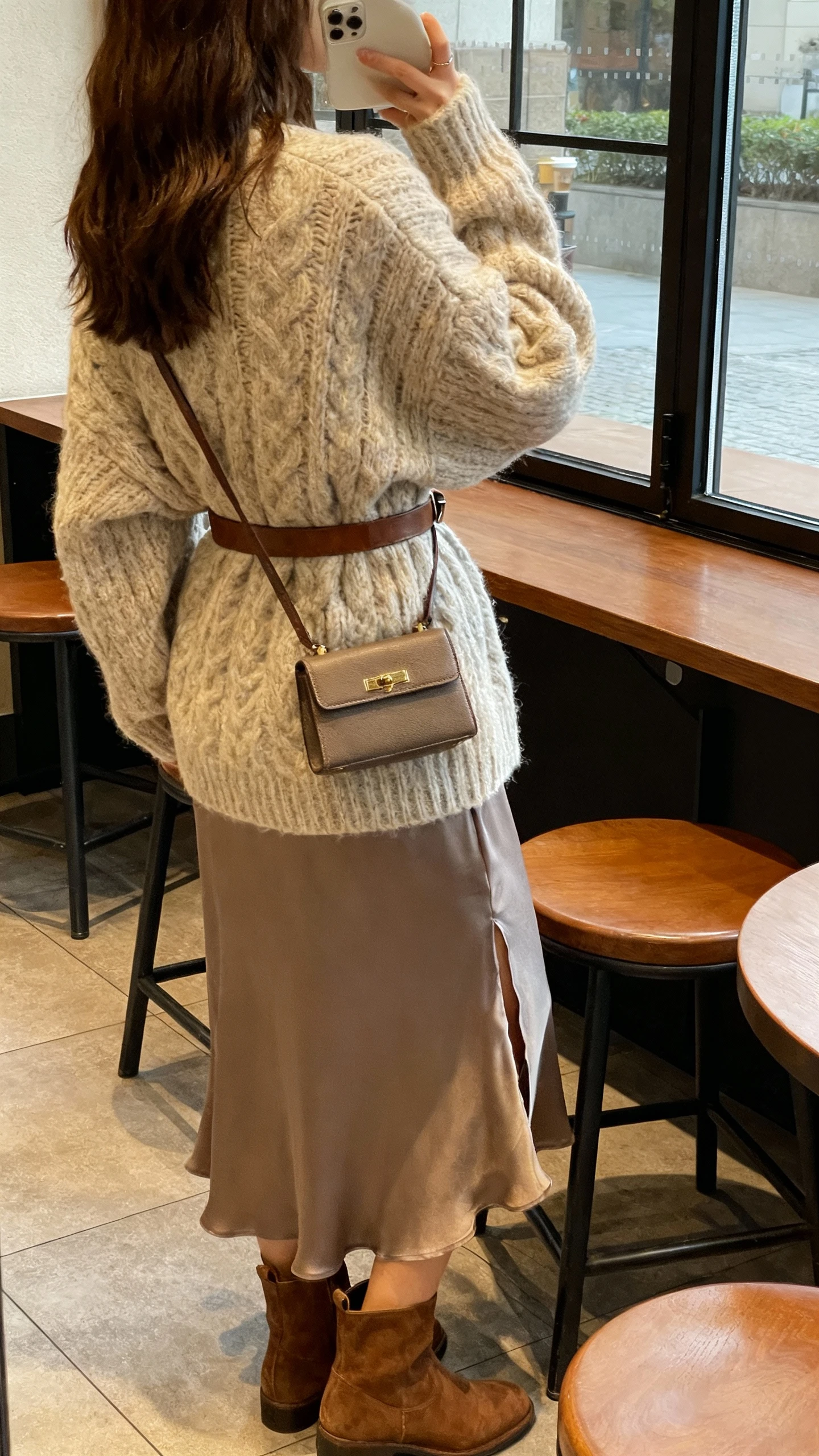 - Balance textures: silky slip + fuzzy knit + smooth leather belt = high-low magic.
