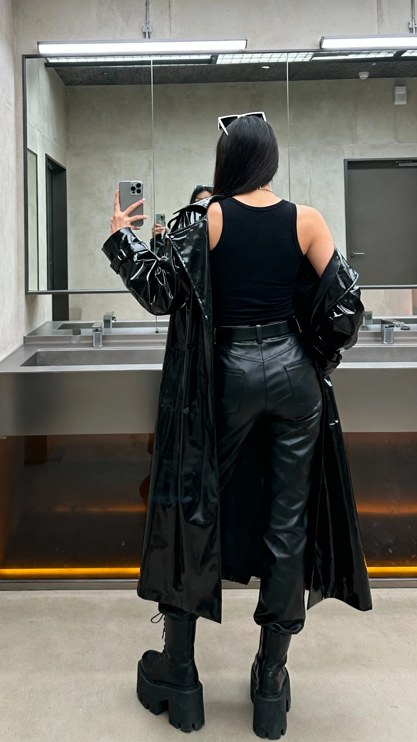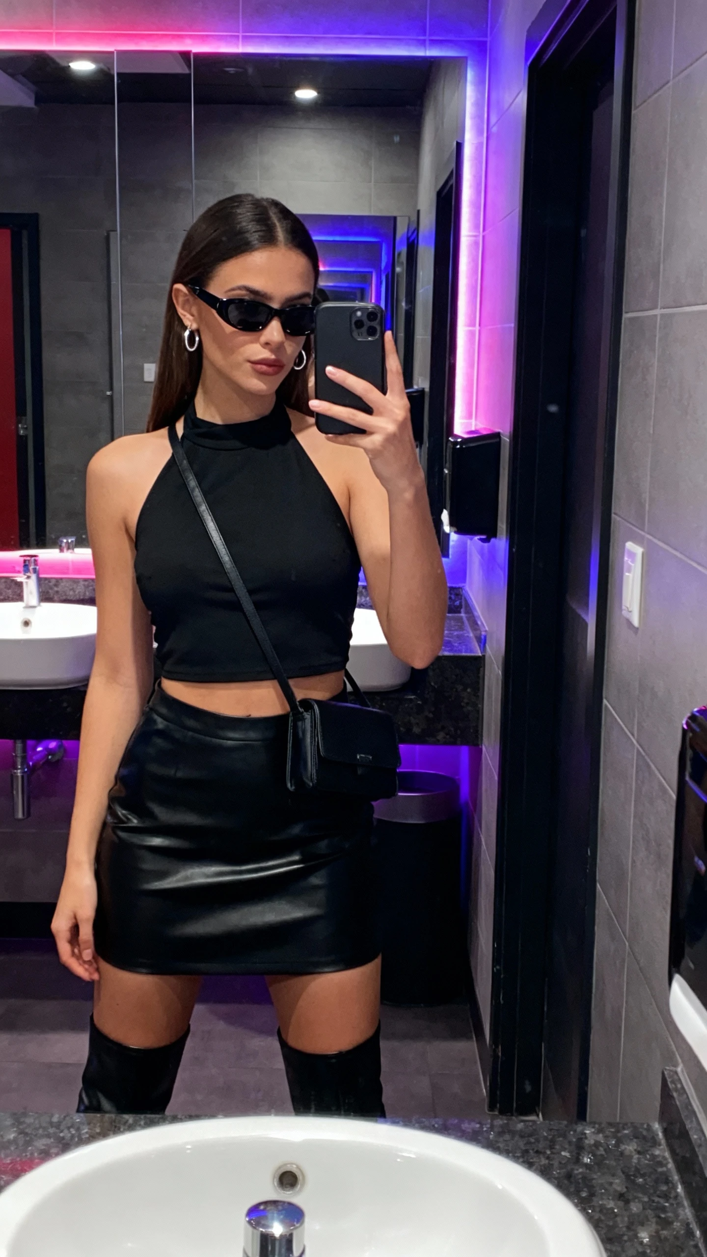 Glossy-black minimalism with razor-sharp edges—this look is built for after-dark adventures. It’s all about clean lines, confidence, and a little vampire energy (minus the daylight issues). The silhouette is streamlined, the vibe is lethal-chic.