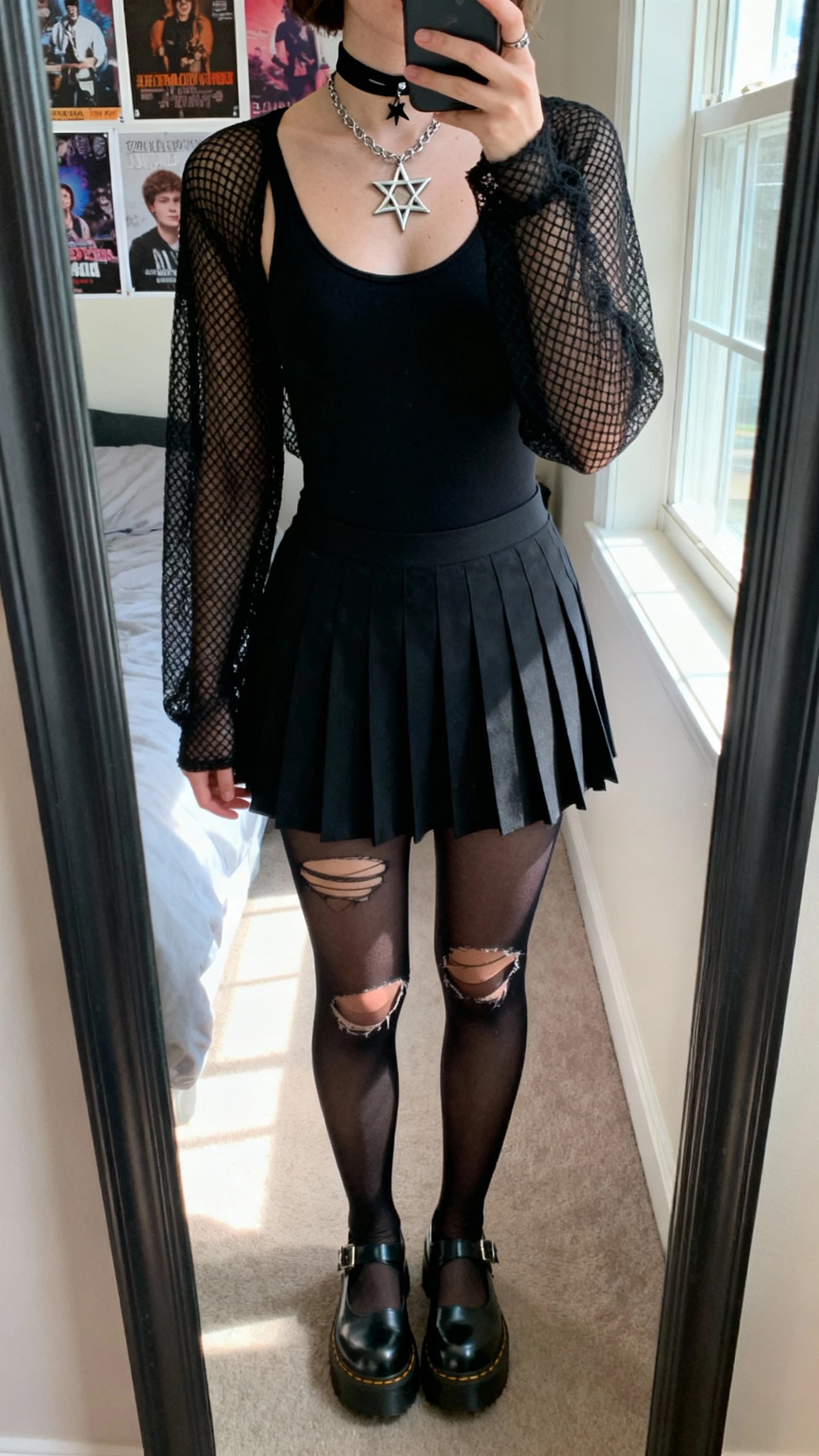 Channel the magnetic mood of 90s witchy teens with a dark-sweet blend: Catholic school silhouette meets goth club kid. It’s flirty, a little dangerous, and totally wearable from day to night. The secret? Balance preppy details with occult accessories and unapologetically heavy shoes.
