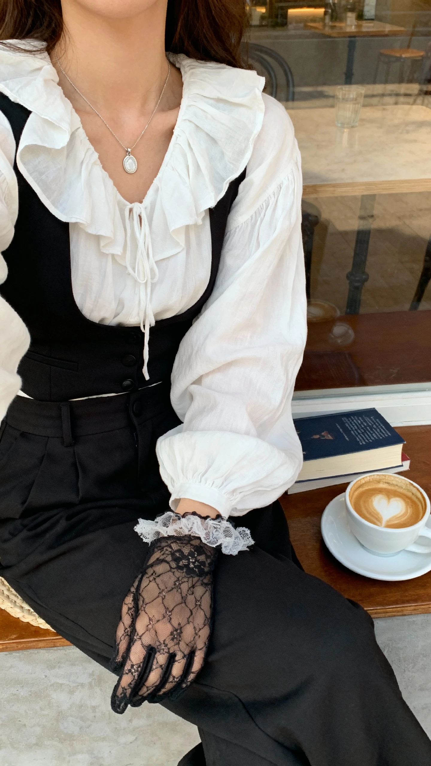 • Tuck the blouse into high-waisted trousers and cinch with a corset belt to create shape. Balance volume on top with a clean, tailored bottom.