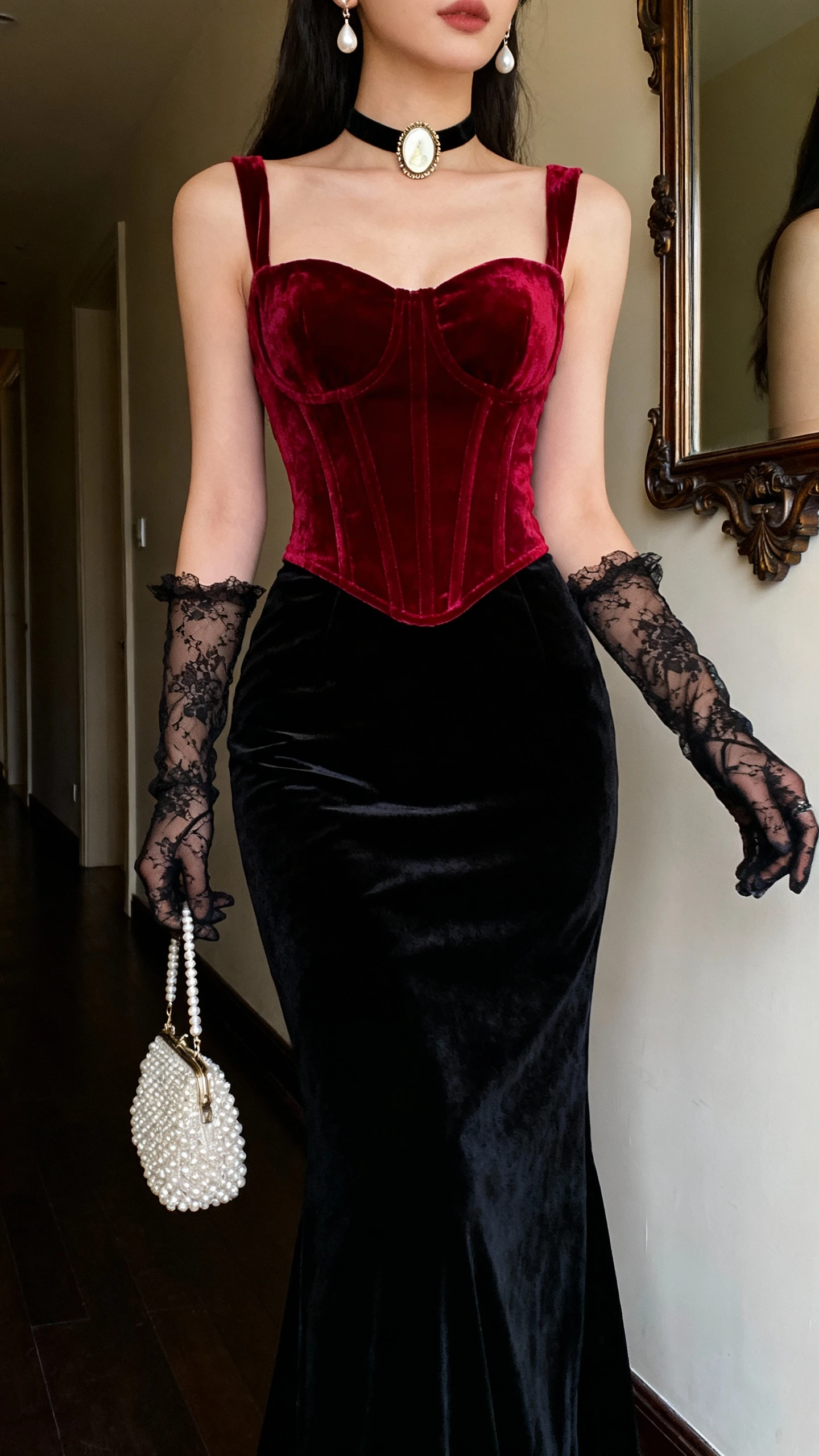 • Layer the mesh top under the velvet slip for texture play; keep the fit close to the body to avoid bulky layers.