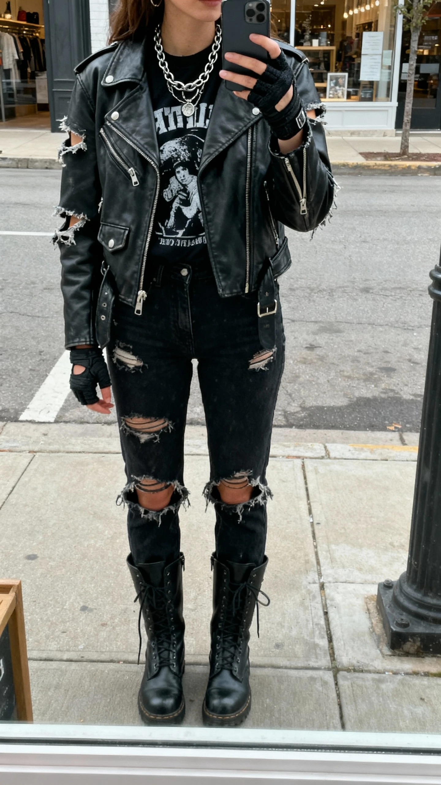 Wear this to gigs, weekend coffee runs, or any time you want your outfit to say “I have a secret.” For warmer weather, swap the sweater for a shredded tank and add a mesh top. For a dress version, try a black slip with a moto jacket and fishnets.