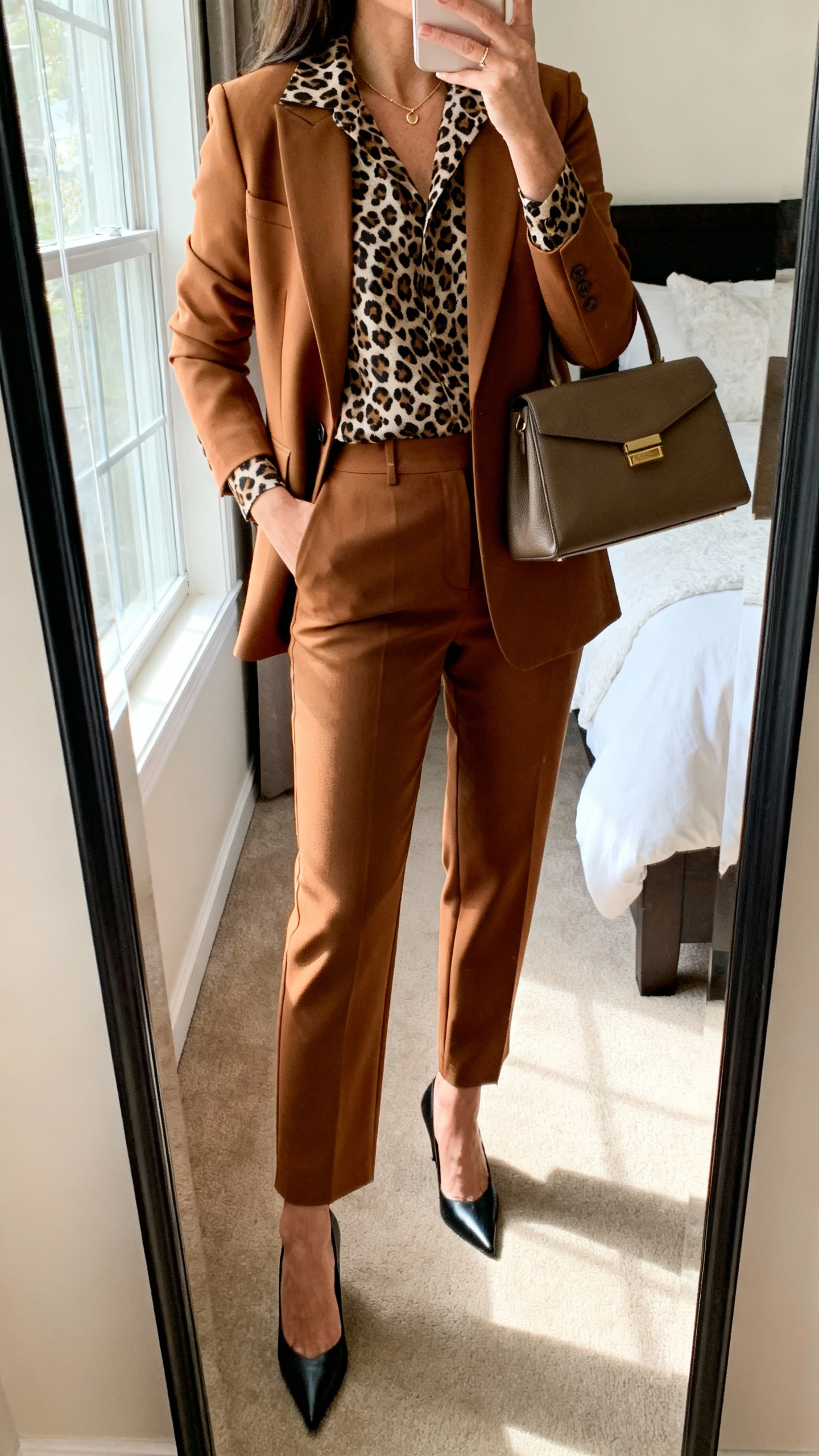 If you’re ready to lean in, this is your moment. Pair a cheetah print blouse with a tonal suit—think camel, sand, or warm brown—for a powerful, editorial look that still reads professional. It’s bold, but not loud, thanks to the controlled color palette.