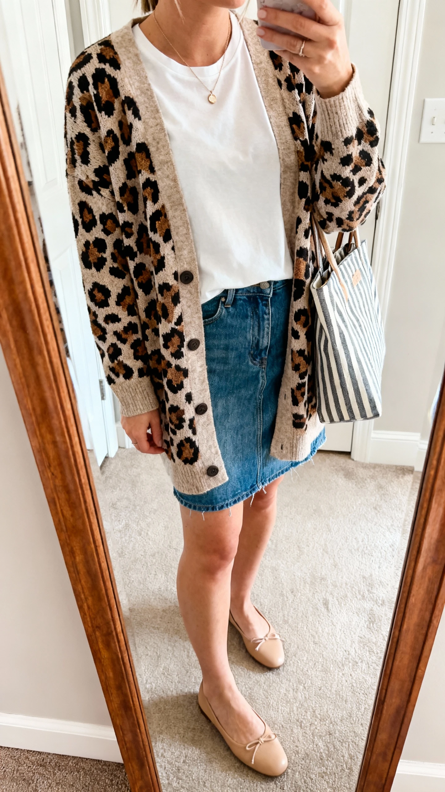 5. Weekend Chic: Cheetah Cardigan + Denim Skirt That Feels French