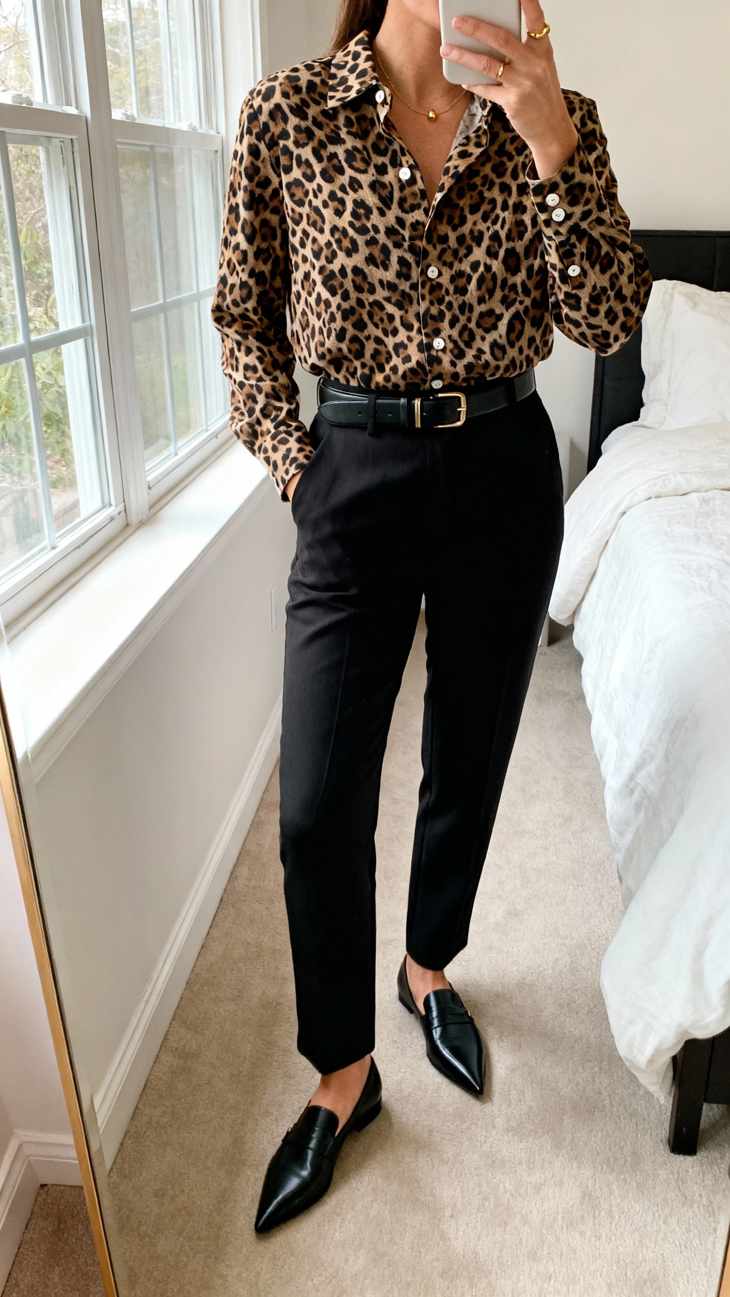 This is the “I’ve got my life together” outfit—without feeling stiff. A crisp cheetah print button-up tucked into tailored trousers is streamlined, smart, and subtly playful. It’s perfect for the office, presentations, or anytime you want to look put together in seconds.