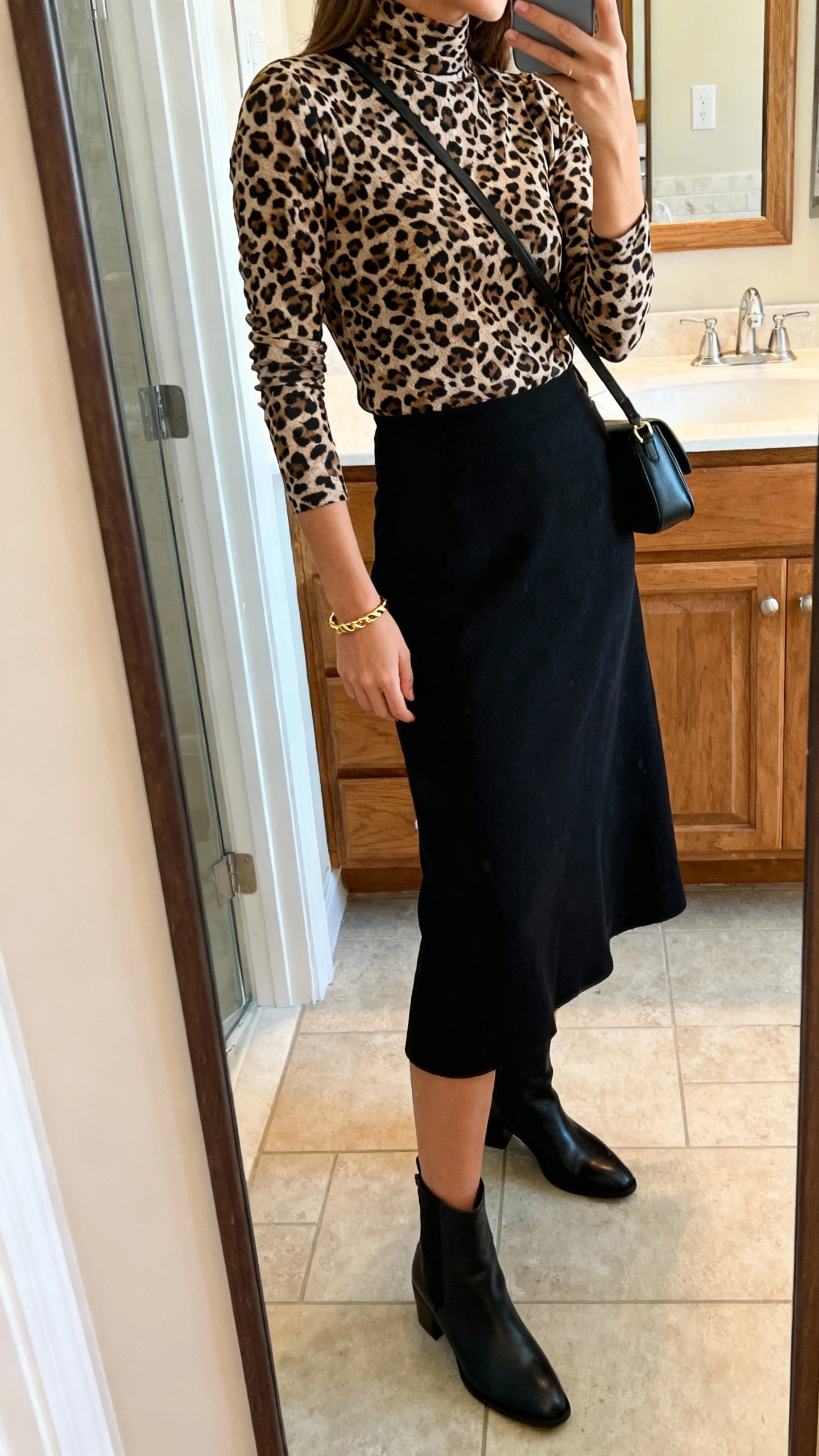 2. Cheetah Mock Neck + Black Midi Skirt That’s Effortlessly Elegant