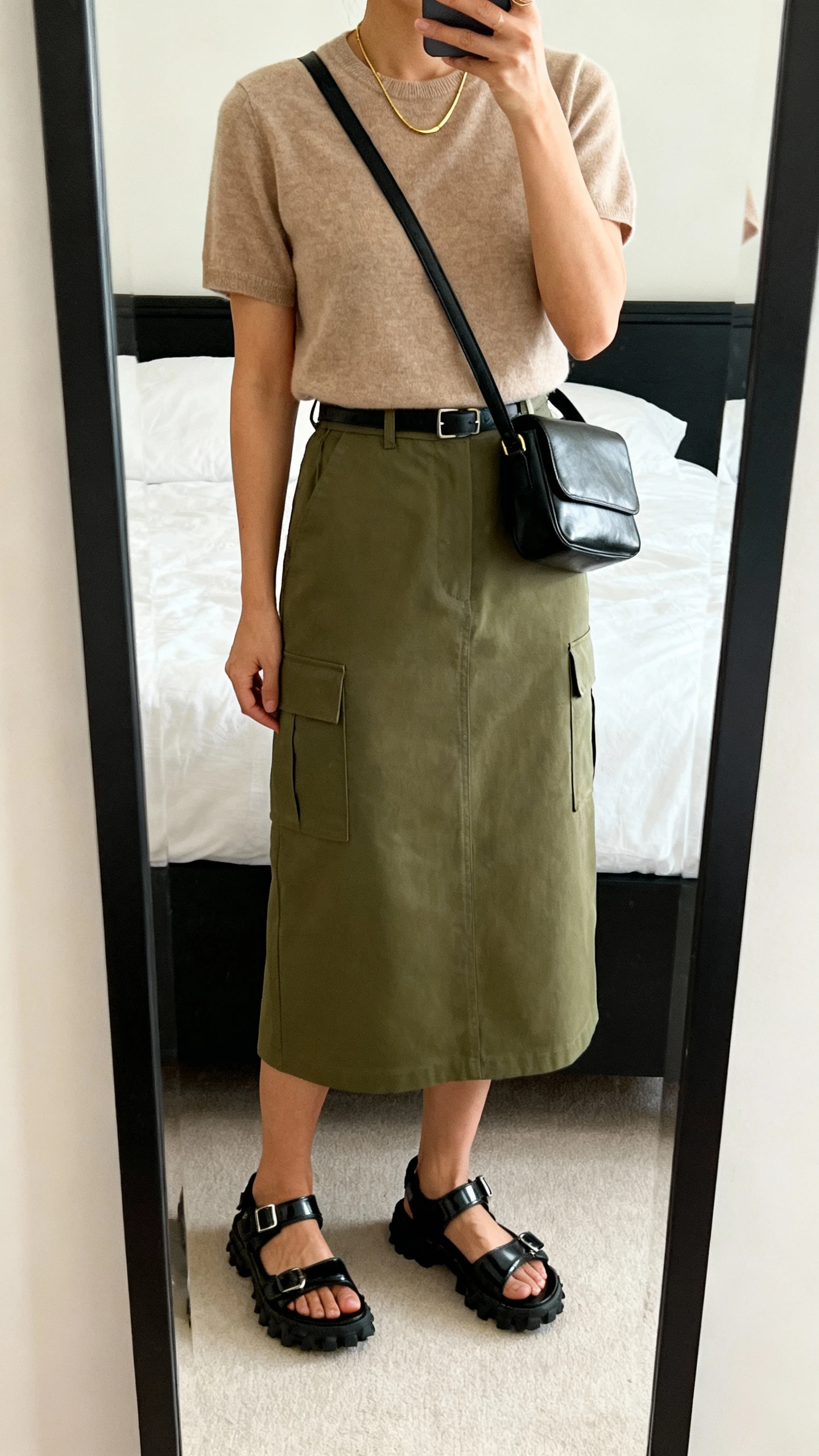 6. Cashmere Tee, Cargo Midi, And Polished Trek Sandals