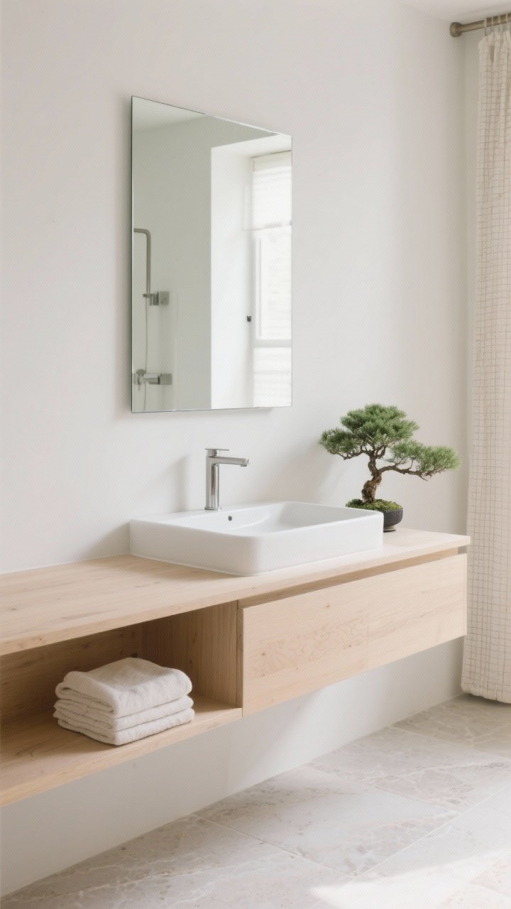 When Japanese minimalism meets Scandinavian warmth, you get serene efficiency. Use light birch or ash wood for a thin-profile floating vanity and a rectangular above-counter sink with clean edges. Walls go warm white, while the floor gets large-format porcelain that mimics pale stone.