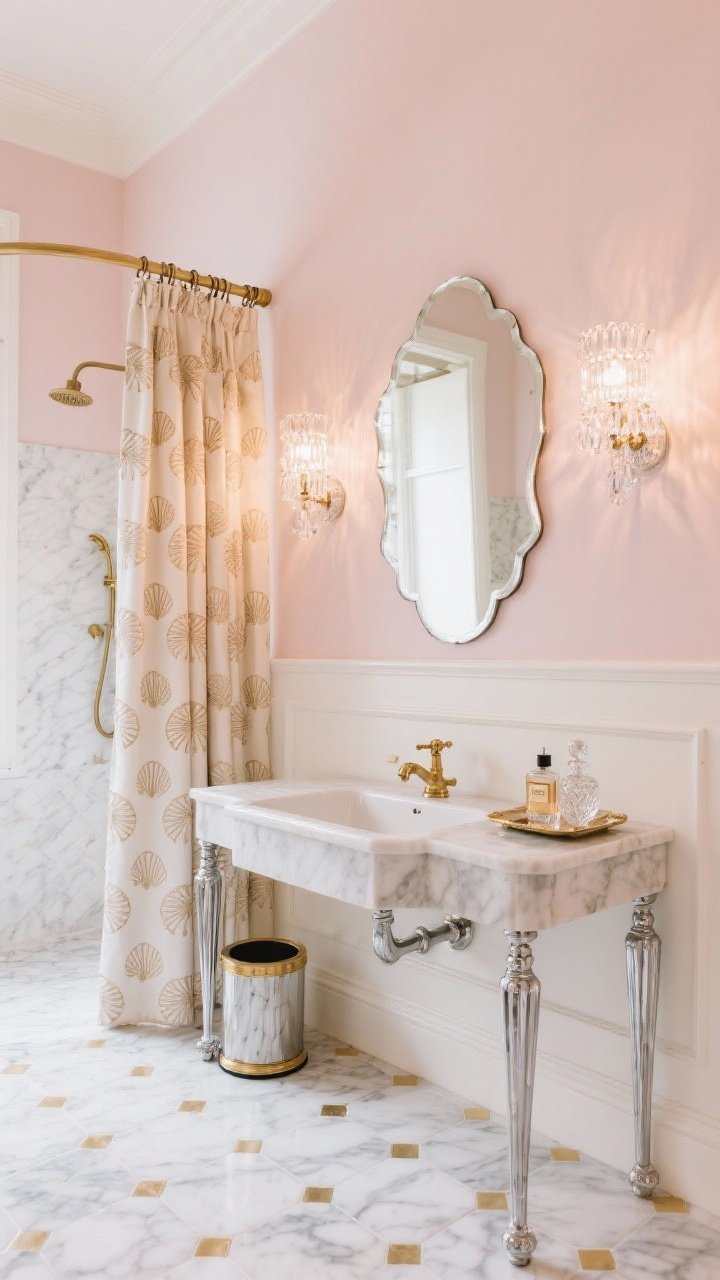 Above it, hang a scalloped or Venetian mirror and flank with crystal-inspired sconces. For the shower, a curved rod adds inches of shoulder room and looks elegant. Layer in a patterned curtain—think subtle art deco fans—and a petite gold-trimmed waste bin.