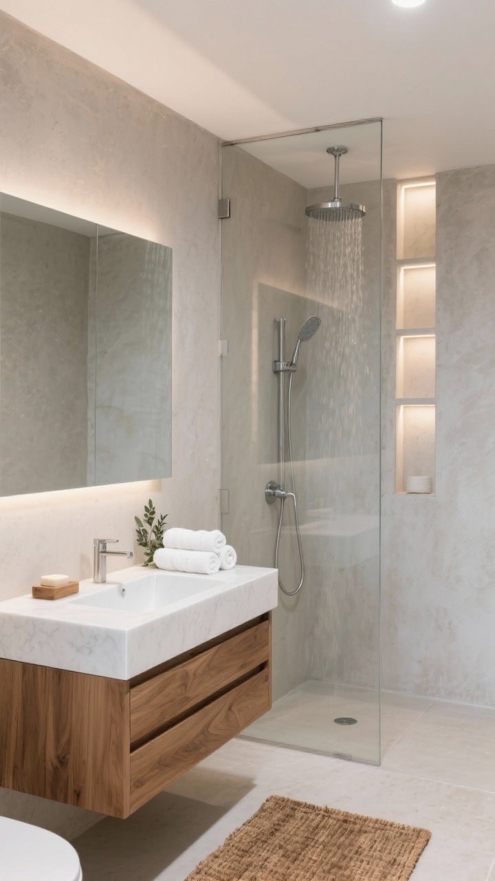 This is your five-star spa moment. Start with greige micro-cement walls or matte beige tiles for seamless calm. Choose a floating oak vanity with integrated drawer pulls and a thin white quartz countertop for that smooth, uninterrupted line.