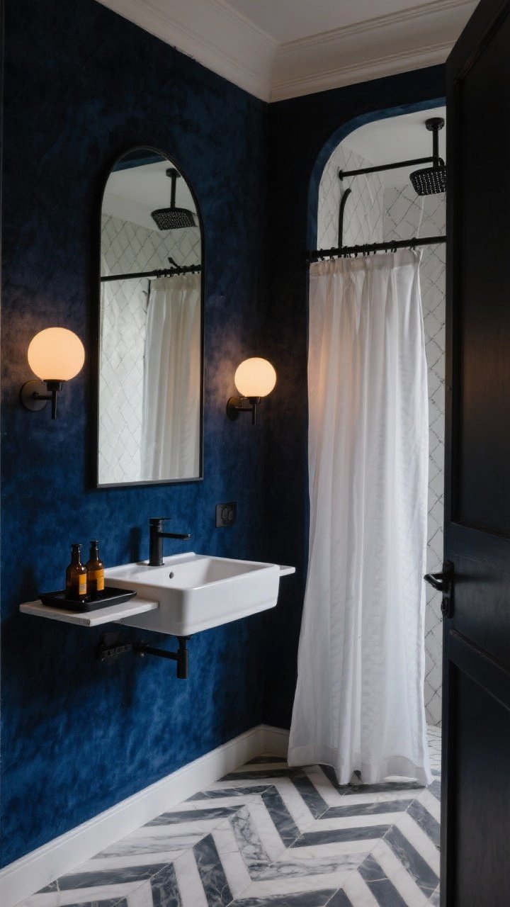 Small bathrooms can pull off drama—especially with a deep, saturated hue. Paint walls a velvety charcoal or ink-blue and balance with a slim wall-mounted sink in crisp white. Go big with a oversized arched mirror in black metal to bounce light and add height.