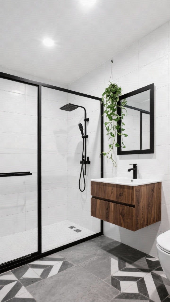 Pick a floating walnut vanity to warm it up, and swap your mirror for a medicine cabinet with an inset black frame for hidden storage. On the floor, go bold with graphic cement-look tiles—think geometric patterns that trick the eye into seeing more space.
