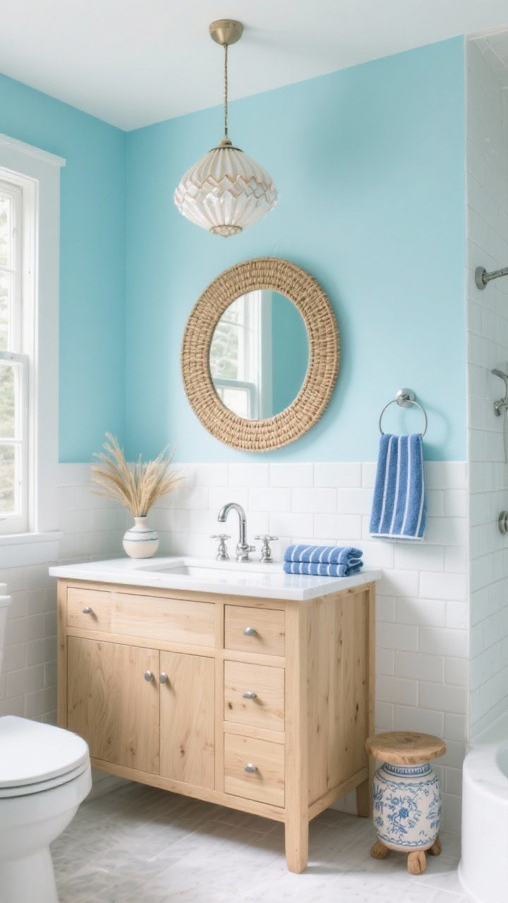 Imagine a breezy beach cottage, but elevated. Paint the walls a soft sea-glass blue and lay elongated white subway tiles in a vertical stack for height. A light oak vanity with soft-close drawers grounds the space and adds natural texture.
