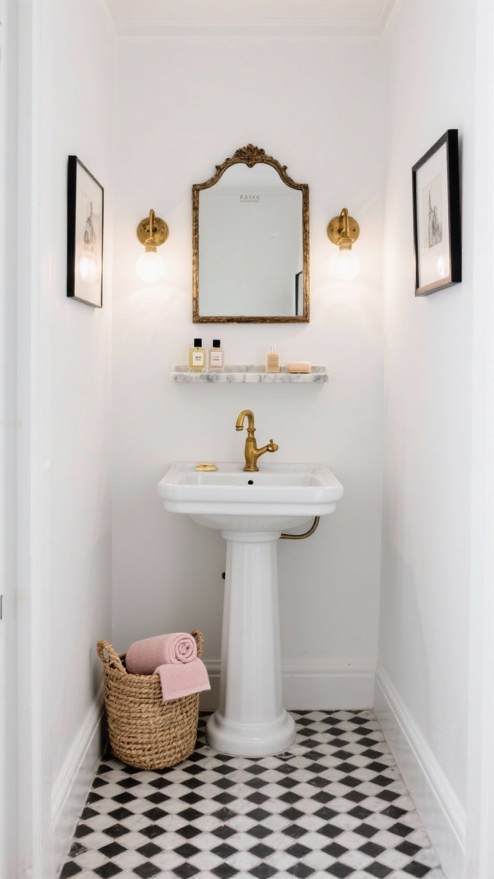 This one feels like a chic Paris apartment squeezed into a few square feet. Think crisp white walls with black-and-white mosaic floor tiles for instant vintage polish. A slim pedestal sink keeps the footprint light, while a brass gooseneck faucet and brass-framed mirror add warmth and shine.