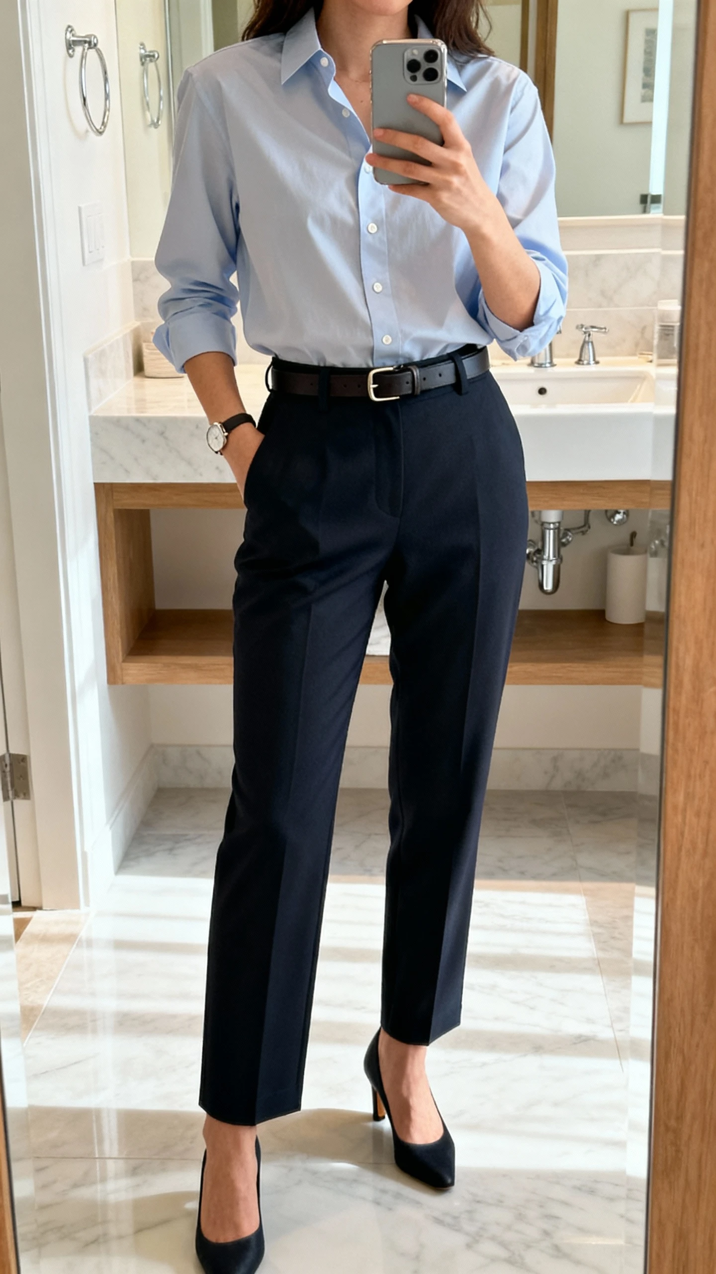 Wear this to meetings, interviews, or presentations. For variety, try a tonal belt that matches the trousers for a longer leg line, then add interest with a patterned blouse. Clean, sharp, and camera-ready for any Zoom surprise.