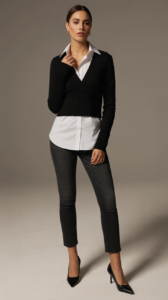 Layering is everything. A cropped sweater over a crisp collared shirt adds dimension, making your bust appear fuller.