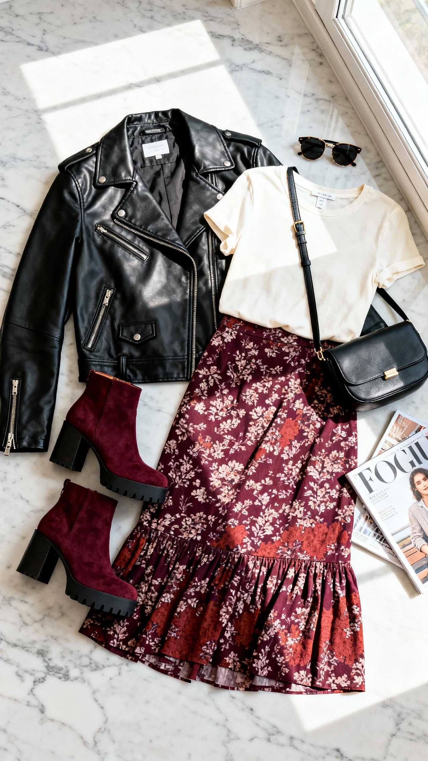 5. Weekend Cool: Leather Jacket, Flowy Skirt, And Burgundy Edge