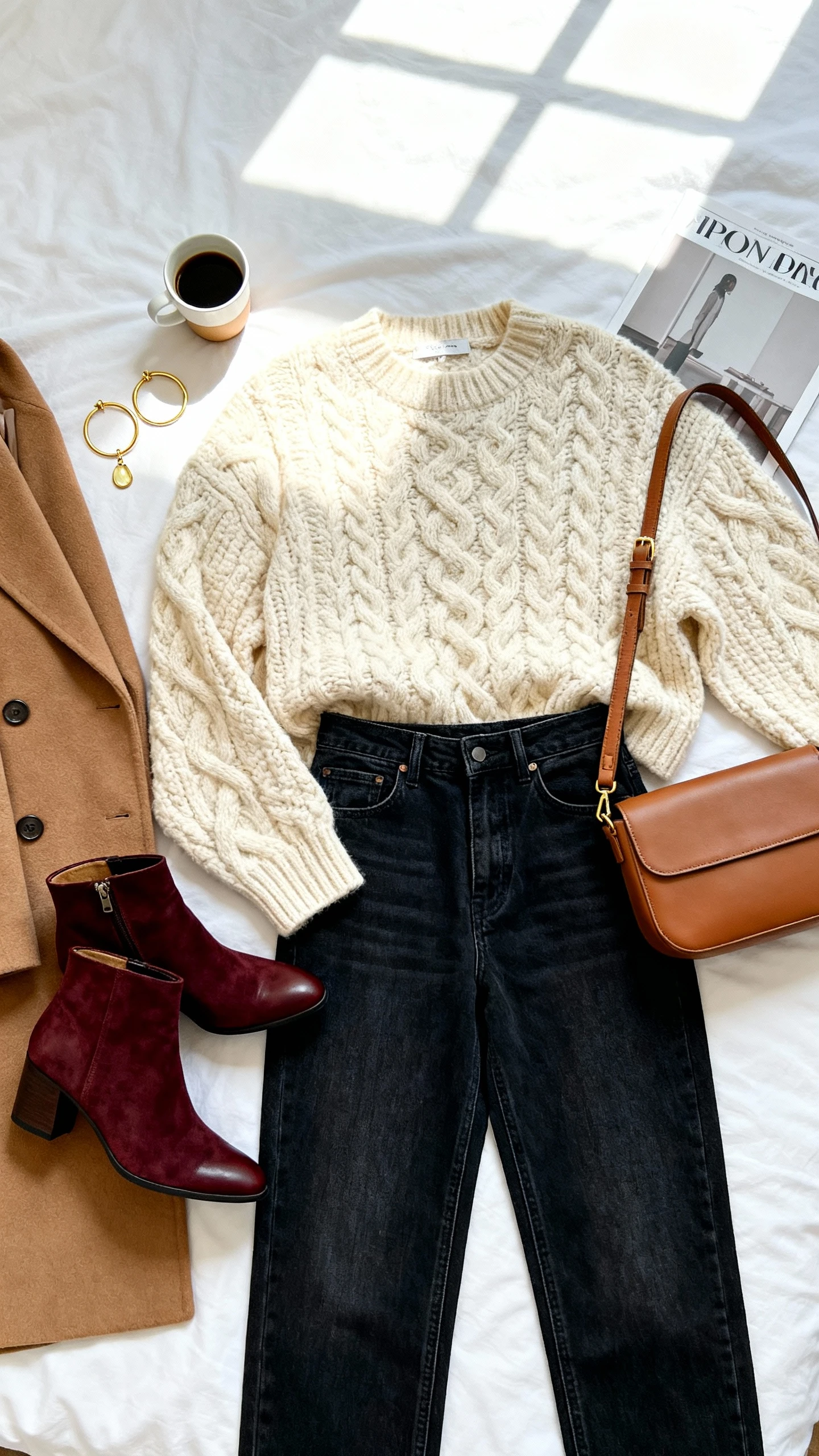 - Chunky cream or beige cable-knit sweater (slightly oversized)