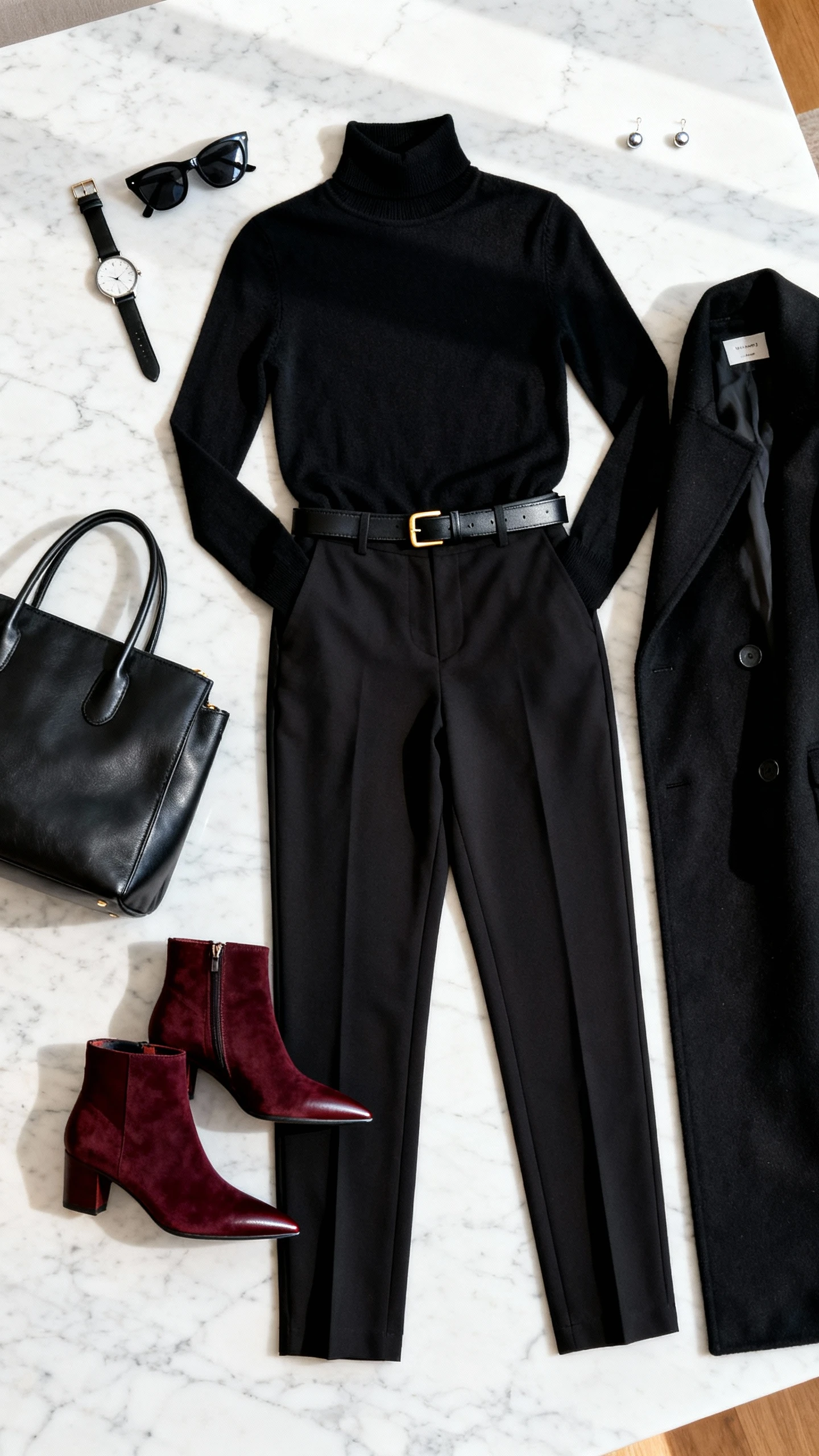 - Echo burgundy in the scarf or lip color, but keep the rest neutral.