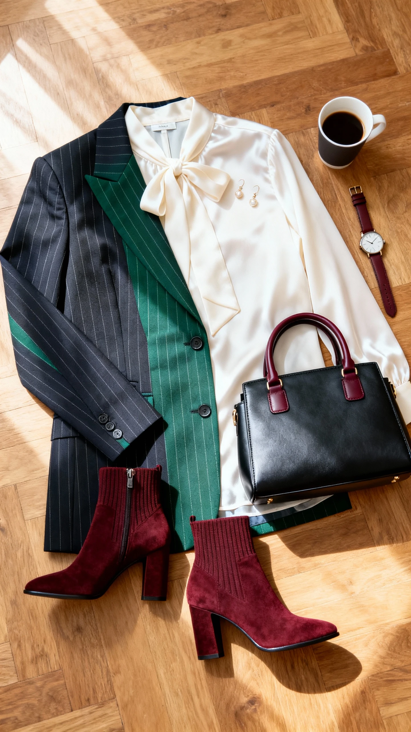 Who says office outfits have to be boring? A tailored two-piece suit gets a modern upgrade with burgundy boots. The boots soften corporate lines and make you look like you actually enjoy getting dressed for work—wild, right?