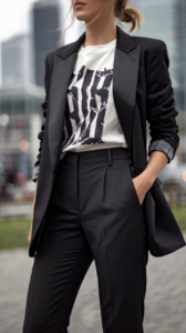 Take your favorite matching trousers and blazer, and instead of a blouse, throw on a graphic tee underneath. Add chunky sneakers or sleek ankle boots, and you’ve nailed that trendy, slightly rebellious office look.