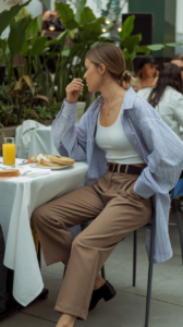 Pair high-waisted trousers (preferably in beige, gray, or black) with a crisp white button-down and clean white sneakers. The vibe? Corporate meets cool-girl off-duty. It’s that outfit you can wear to a 9 a.m. meeting and still look cute grabbing coffee afterward.