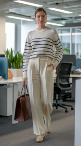 2. The Parisian Vibe: Striped Sweater + Cream Trousers + Loafers