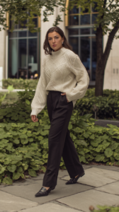 A chunky knit sweater tucked slightly into tailored trousers gives you that Pinterest-perfect fall aesthetic. Add loafers or ankle boots, and you’re instantly the main character at your favorite café.