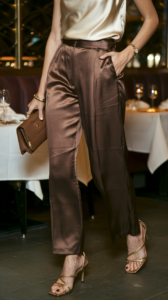 Satin trousers in jewel tones (emerald, champagne, or chocolate brown) with a silky camisole are a guaranteed jaw-dropper. Add strappy heels and a clutch bag, and you’re dinner-ready in five minutes.
