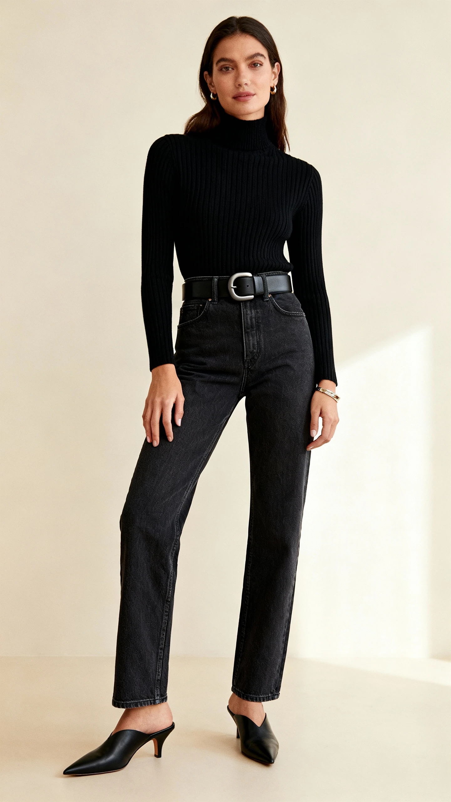 4. The Minimalist Power Tuck: Monochrome Knit, Dark Denim, And A Thick Tonal Belt