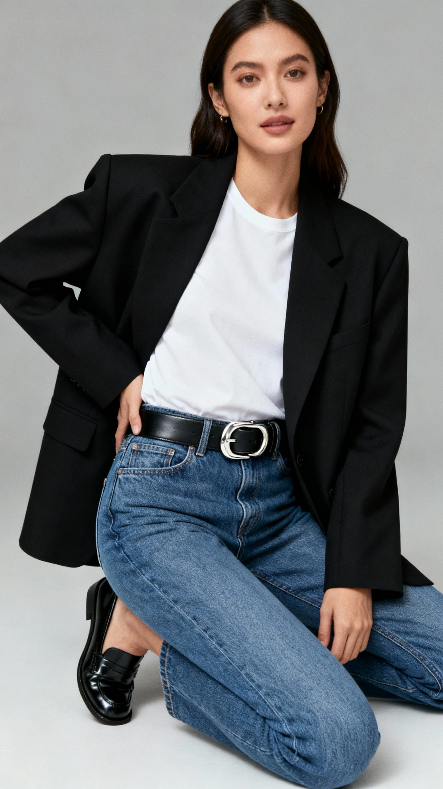 This outfit is your shortcut to “I just stepped out of a street-style roundup.” The structure of a boxy blazer paired with straight-leg jeans gets elevated by a chunky leather belt with a standout buckle. It’s smart, sharp, and a little undone—in the best way.