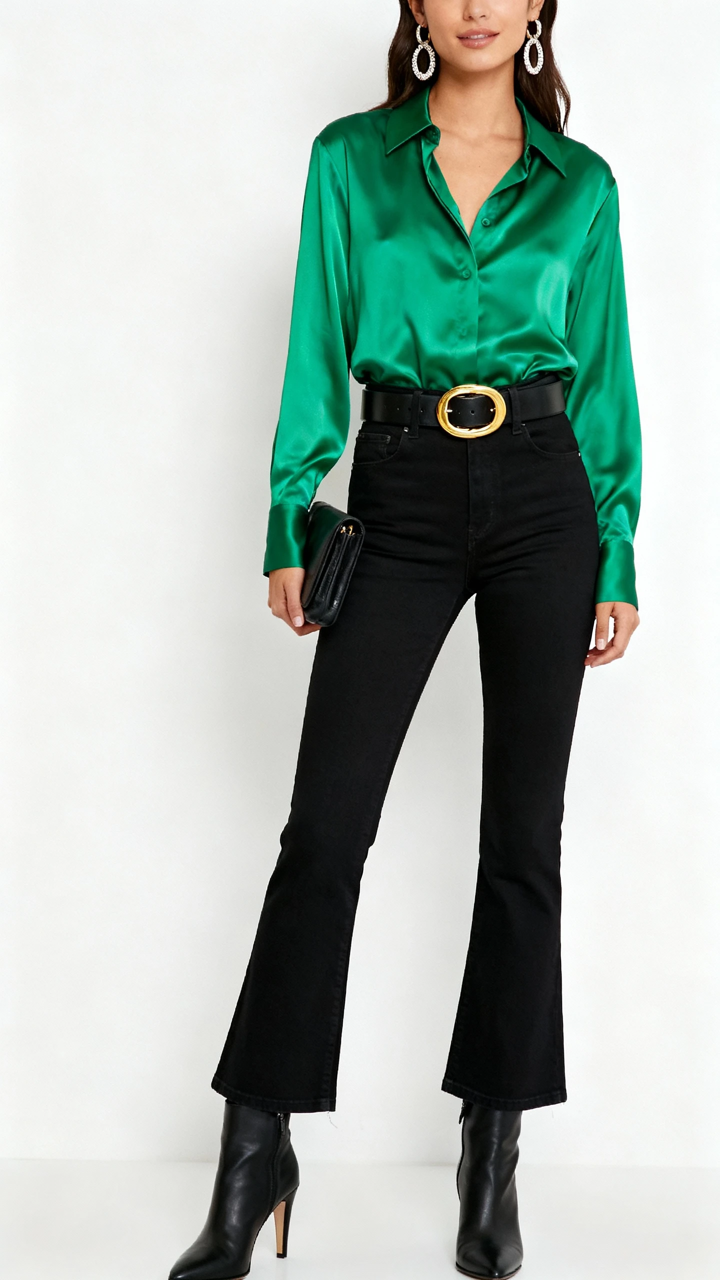 When your plans call for sleek but not try-hard, this combo serves. A silky satin blouse and slim black jeans meet a chunky belt with a striking gold buckle—it’s minimal with a hint of drama. Perfect for dinners, drinks, or anywhere flattering lighting might be present.