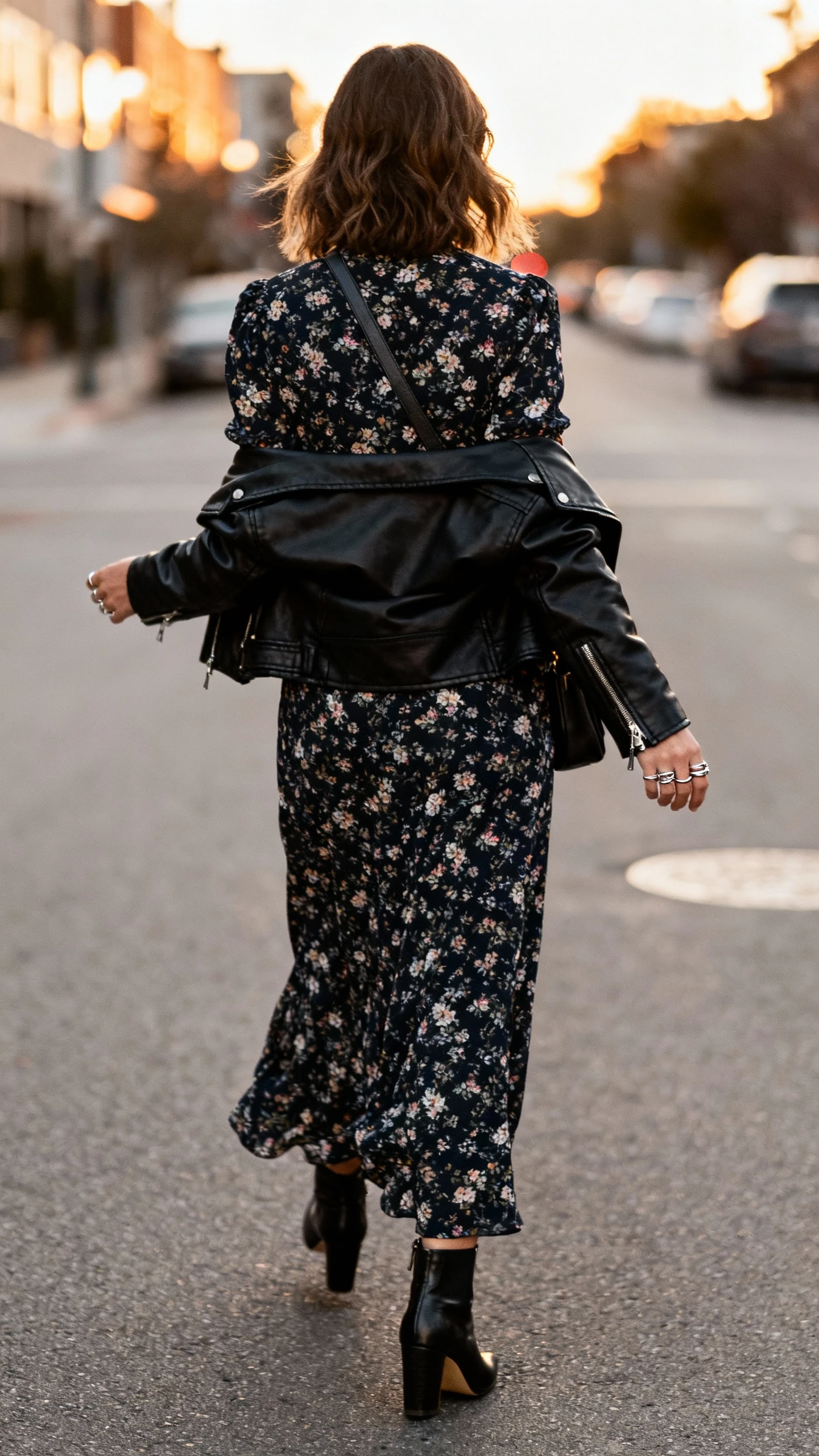 Floaty meets fierce in this classic dark-romantic combo: a moody floral maxi and a sharp leather jacket. It’s all about contrast—the skirt swishes, the jacket slices, and together they create instantaneous main-character energy. Plus, it’s incredibly versatile across seasons.
