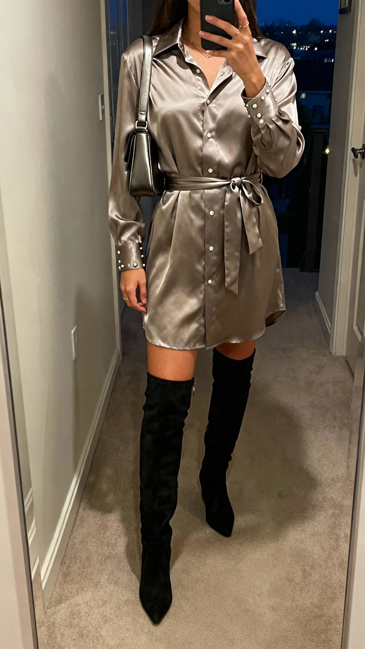 7. Satin Shirt Dress And Over-The-Knee Boots That Owns The Night