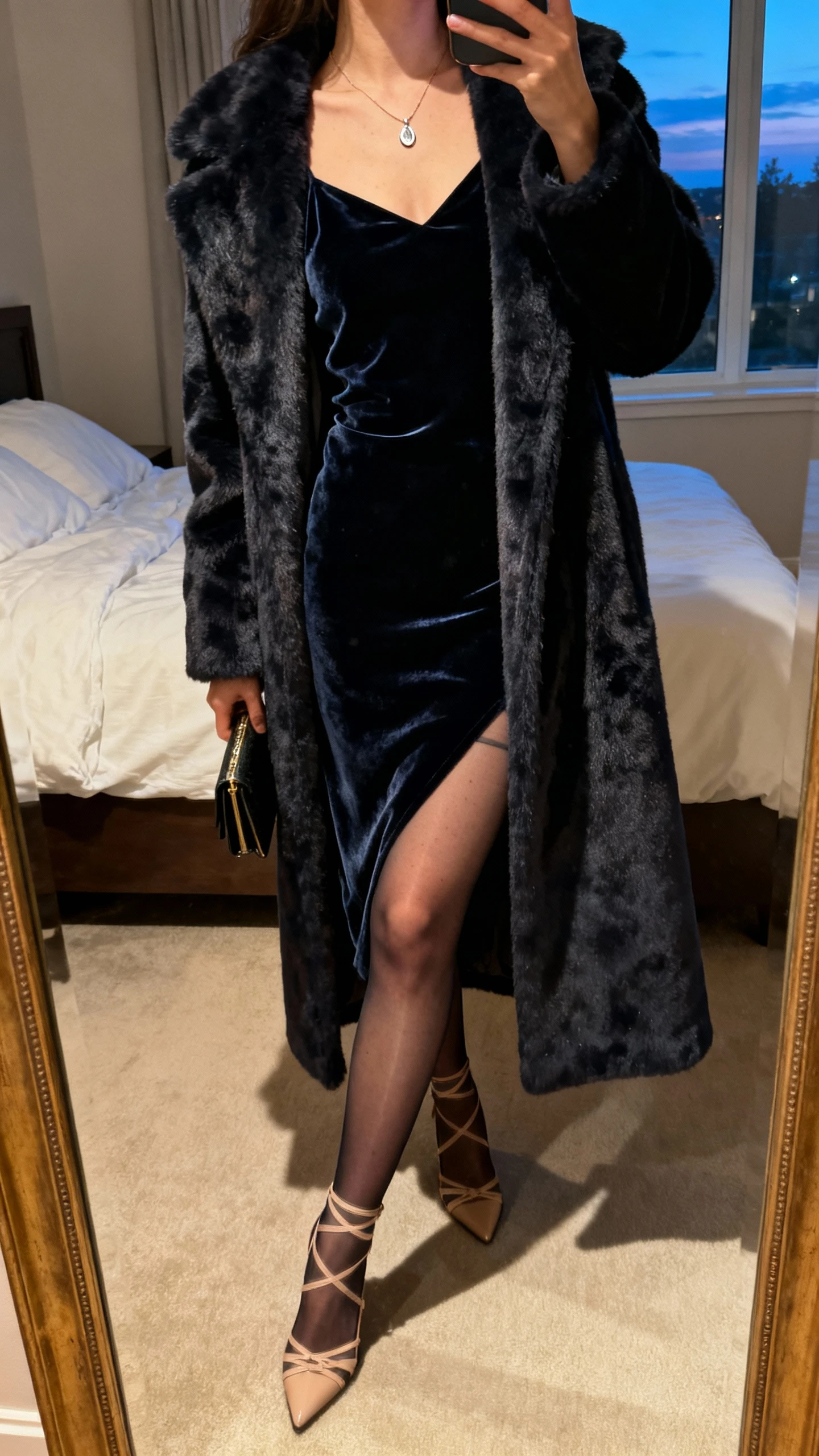 Wear this for anniversaries, jazz clubs, or rooftop cocktails. Swap the blazer for a cropped leather jacket if the venue skews cool, or layer a longline satin duster for extra sweep. If you prefer flats, try sleek pointed slingbacks—still polished, just comfier.