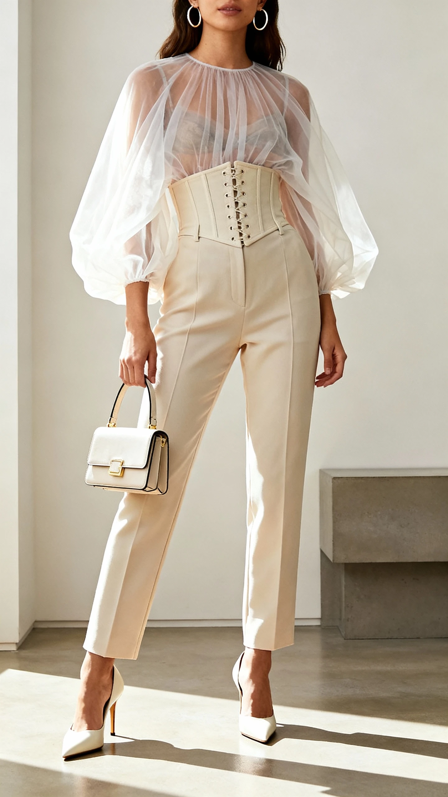 3. Corseted Trousers And Sheer Drama Top That Means Business (The Fun Kind)