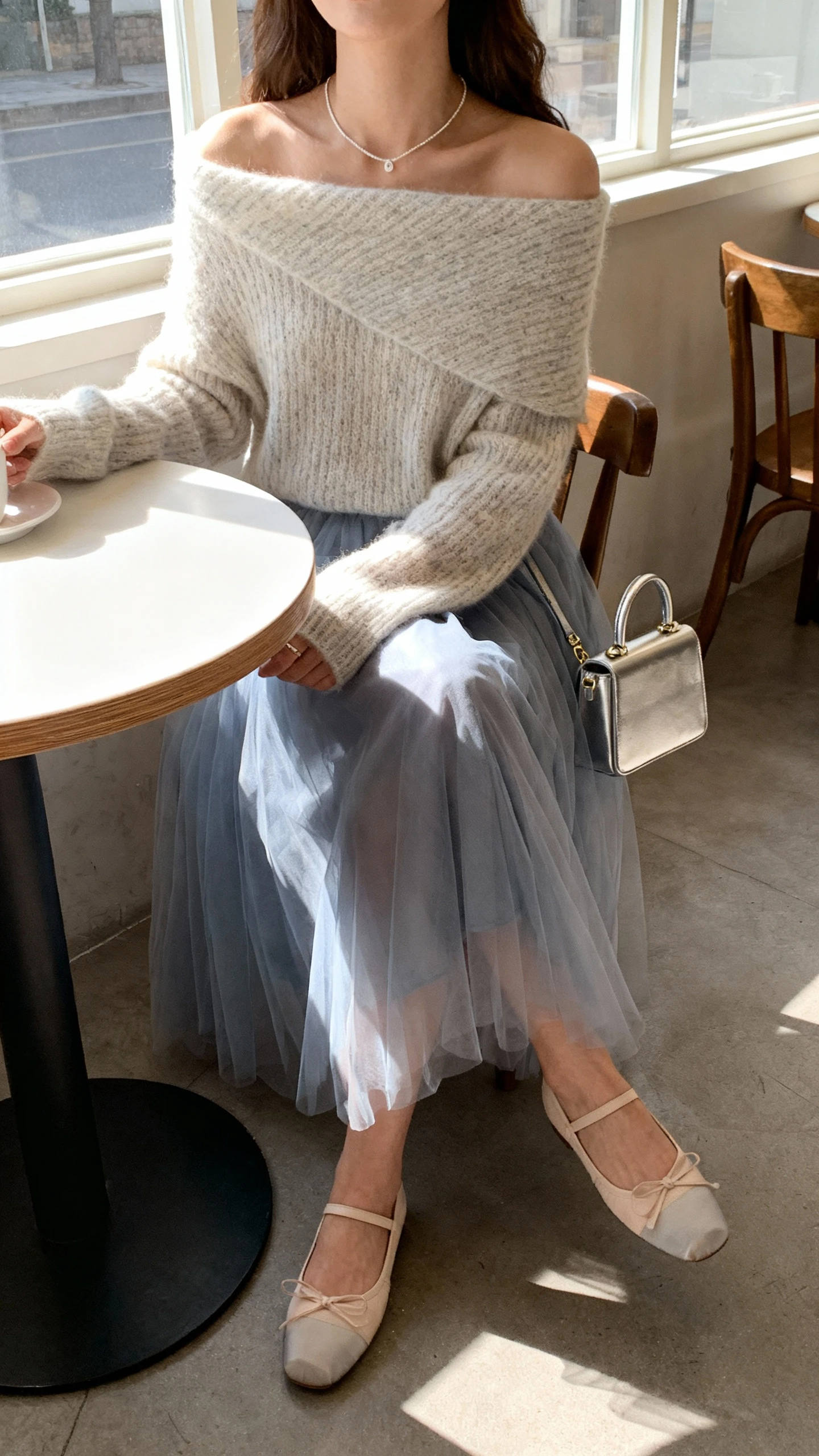 6. Moonlit Tulle Skirt And Knit Off-Shoulder Combo That Feels Like A Secret