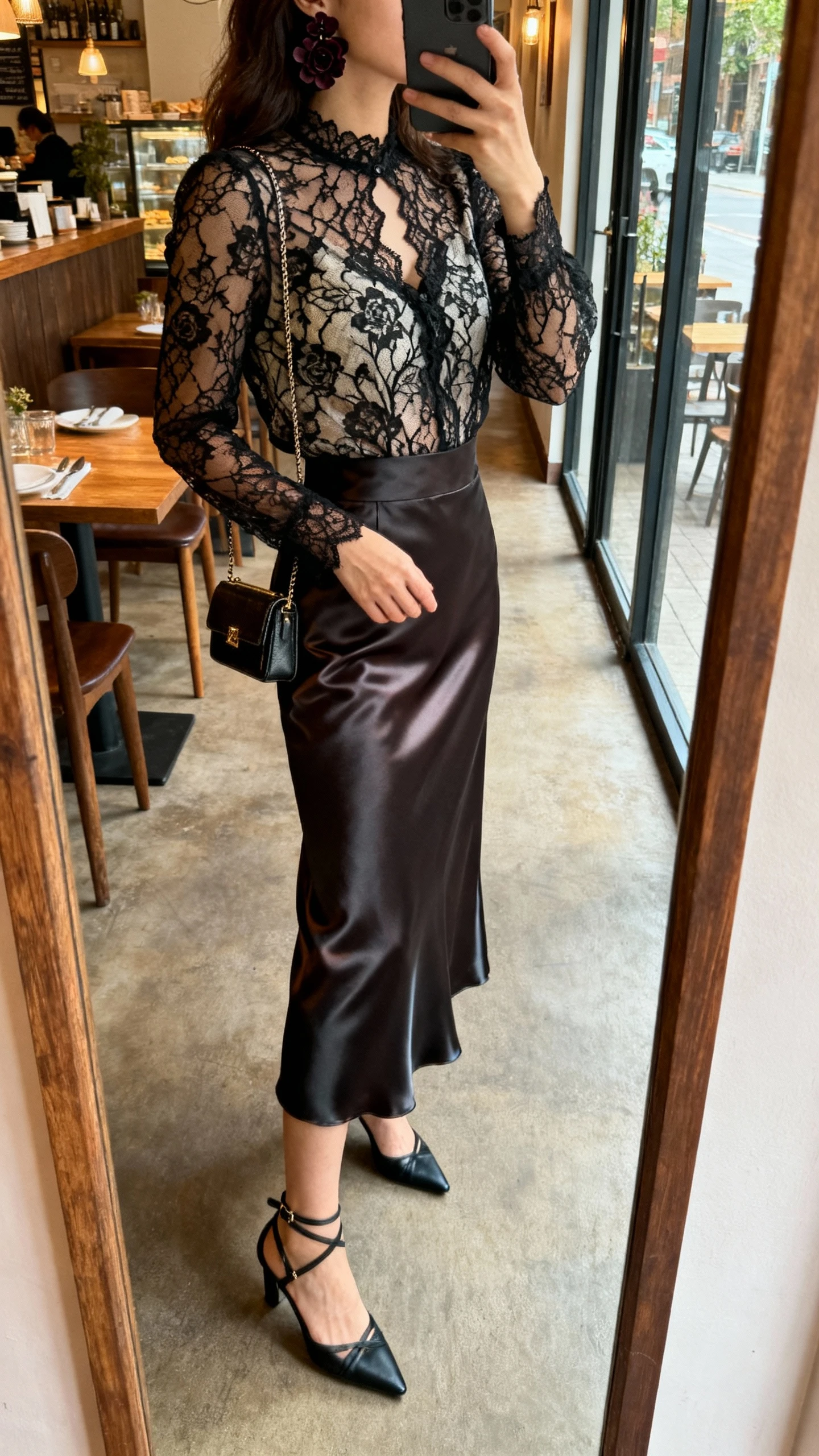Romance gets modern when you pair soft lace with liquid satin. It’s the kind of outfit that moves beautifully and photographs like a dream under low light. The contrast—airy lace, fluid skirt—creates a silhouette that’s flirty, elegant, and a little mysterious.
