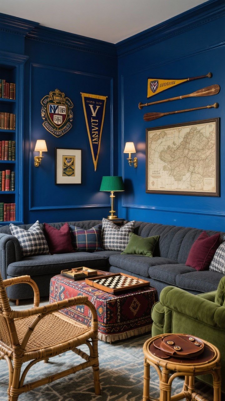 Flank a kilim ottoman with bamboo side tables and tuck in cane-back accent chairs. The art mix is key: vintage crests, rowing oars, old university pennants, and a big antique map.