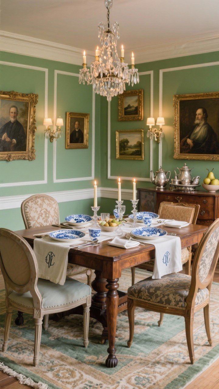 Picture a long mahogany dining table with delicate pad feet and twelve mismatched, heirloom-feel chairs—some balloon backs, some upholstered in damask. The walls go moss green in a matte finish with picture-frame molding for depth.
