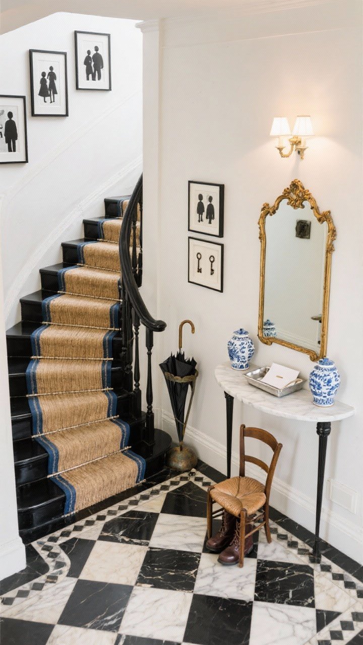 Set the tone from the front door. Lay a classic black-and-cream checkerboard marble floor with a thin border. Paint walls bone white and the staircase in high-gloss black with a sisal runner bound in leather.