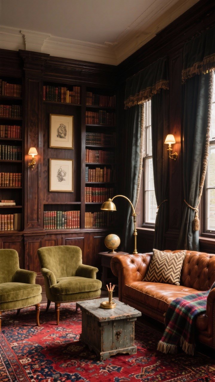 Anchor the space with a cognac leather chesterfield and a pair of club chairs in olive mohair. A Persian rug (reds and indigo) grounds everything while a brass pharmacy lamp arcs over a weathered campaign-style side table.