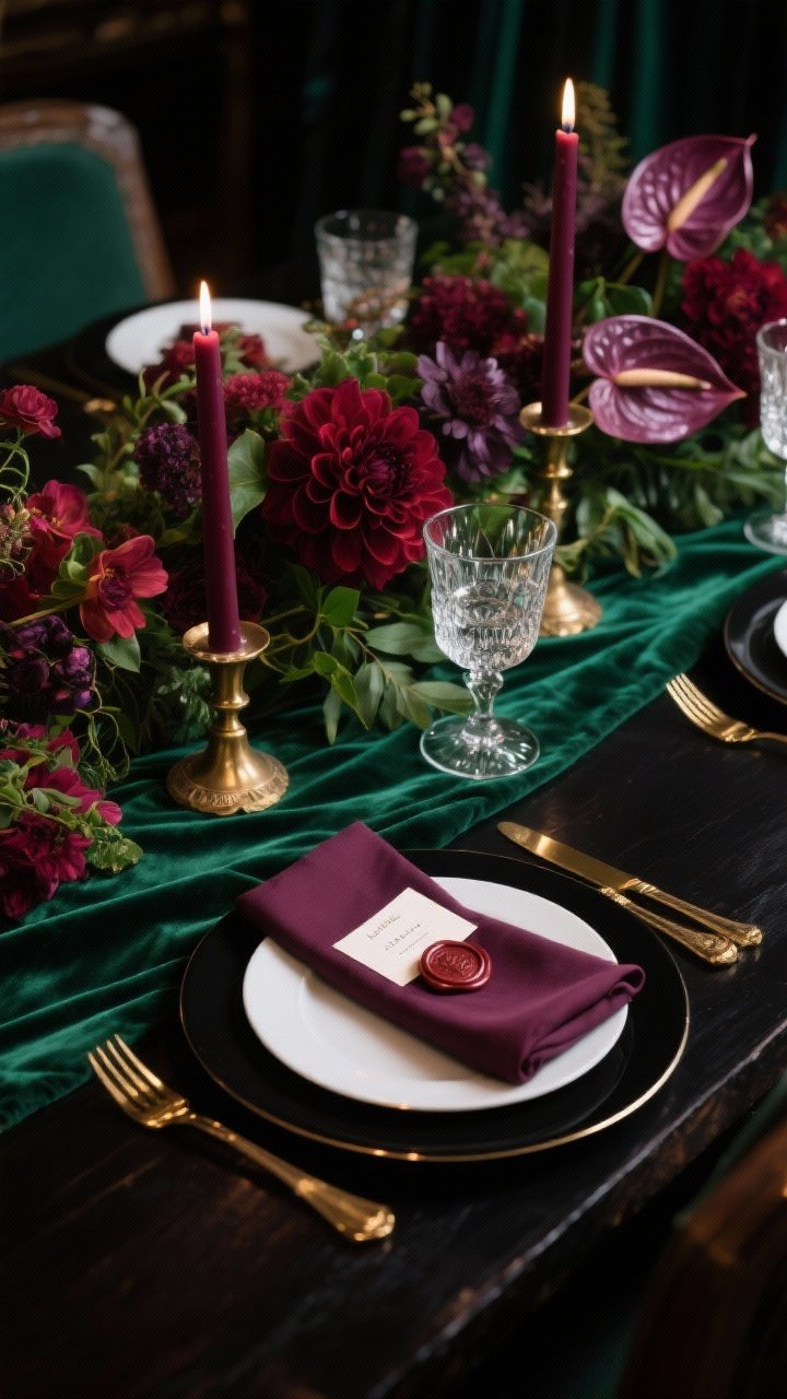 Center the table with overflowing florals in saturated tones—burgundy dahlias, plum anthuriums, and emerald foliage. Tuck in vintage brass candlesticks with wine-colored tapers. Personalize each setting with a wax-sealed place card on a folded merlot napkin.