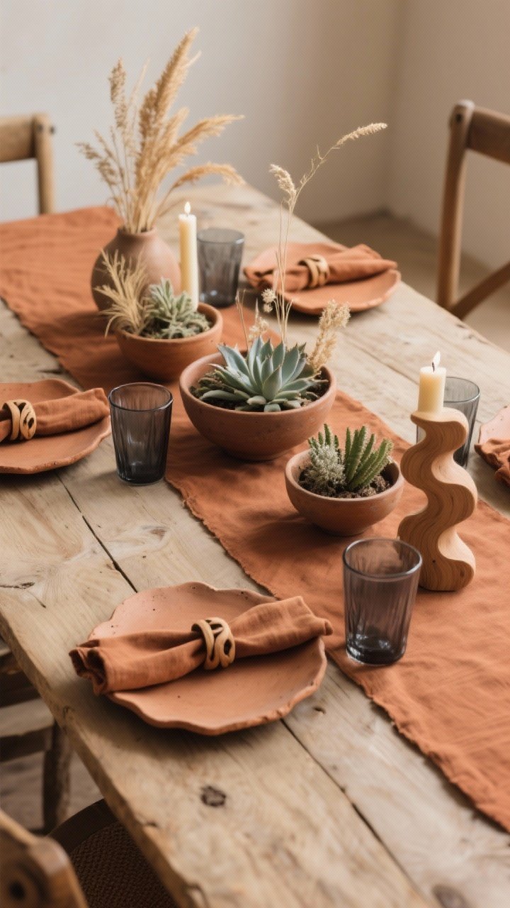 Think sculpted pottery and soft sands. Anchor the table with a terra-cotta runner over a raw wood surface. Choose handmade stoneware with warm clay edges and slightly irregular shapes—every plate feels artisanal.