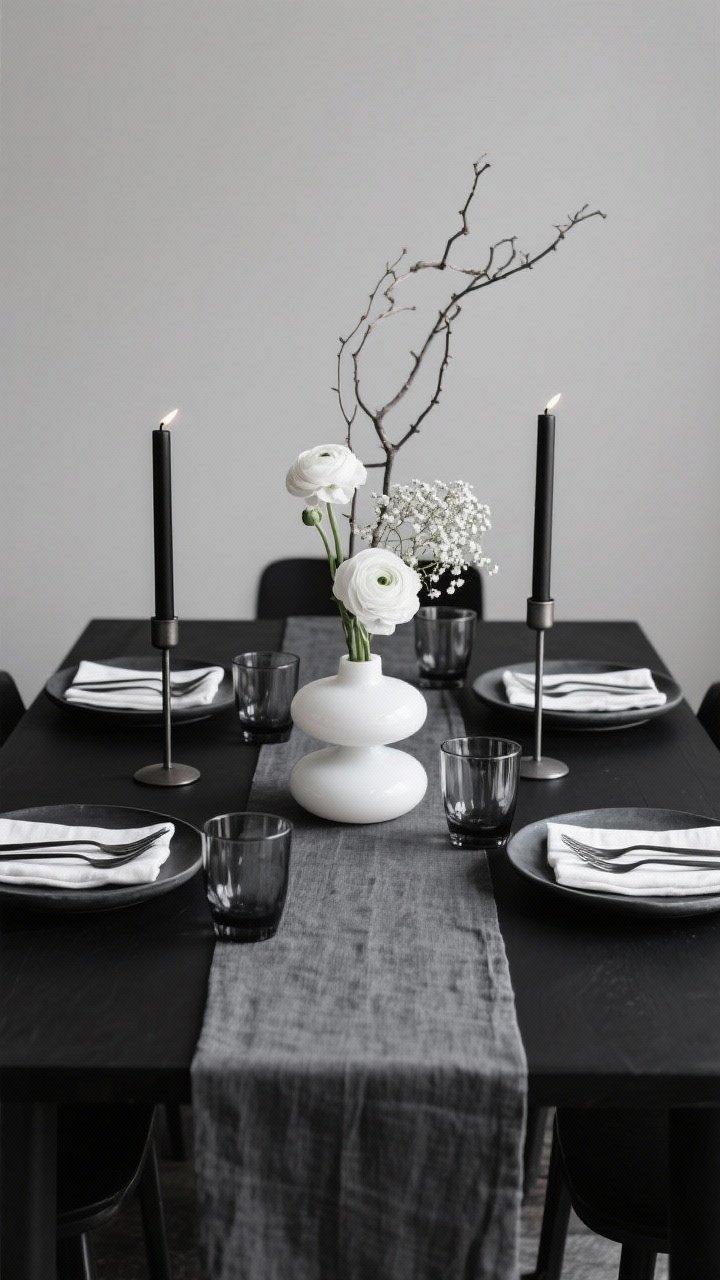 Layer a graphite linen runner down the center and tuck in smoky gray glassware for that moody glimmer. Keep napkins clean and precise: white linen, squared off under each fork. For lighting, use tall tapered black candles in minimal metal holders to elongate the scene.