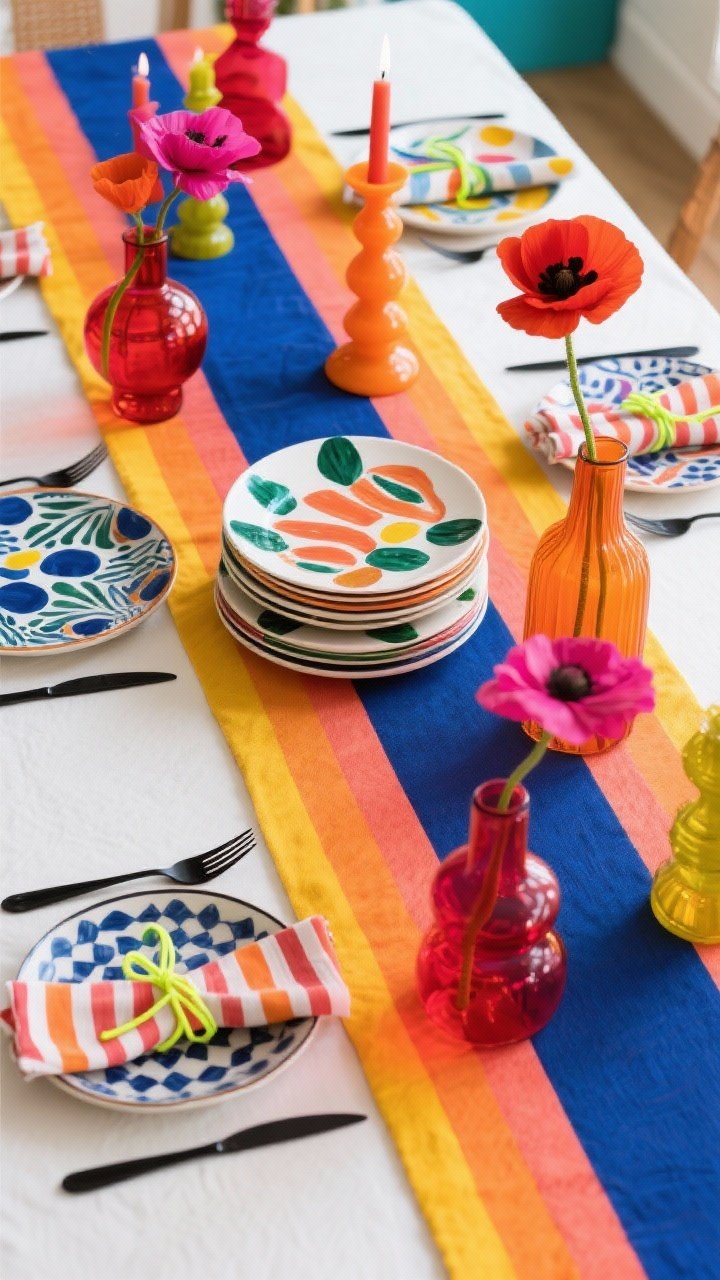 Bring in chunky glass candlesticks in playful colors and striped napkins tied with neon cord. For florals, go wild with poppy red, tangerine, and fuchsia stems in low, sculptural vases. Finish with matte black flatware to ground all that happy color.