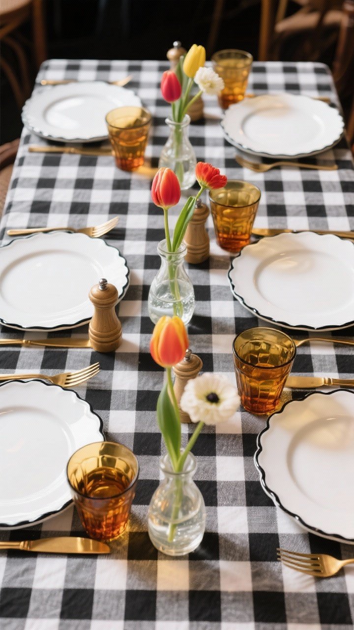 This look is playful, chic, and a little flirty. Start with a black-and-white check tablecloth as your stage. Layer on classic white dinner plates with scalloped edges and a thin black rim, plus brass flatware for a warm note.