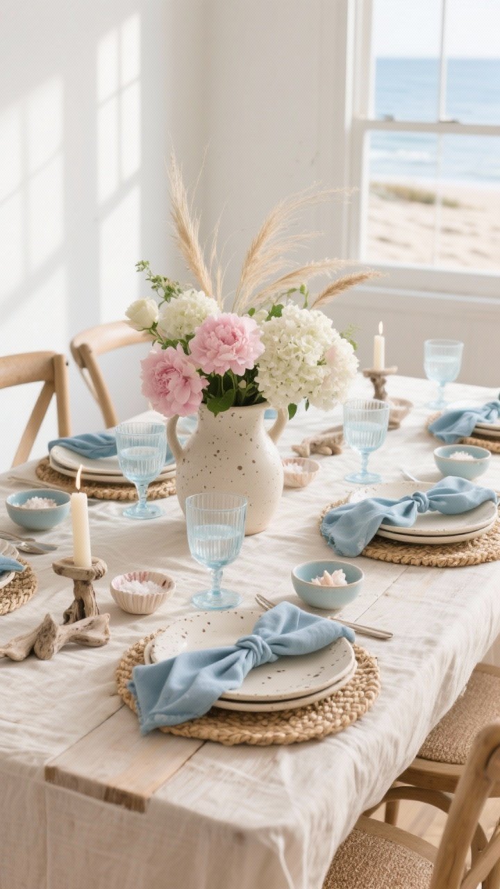 Bring movement with shell-pink and white florals in a ceramic jug—think peonies, hydrangeas, and beach grass. Mix clear, thin-rimmed stemware with a single pale blue water glass for a casual splash of color. Finish with driftwood candleholders and tiny bowls of sea salt at each setting.