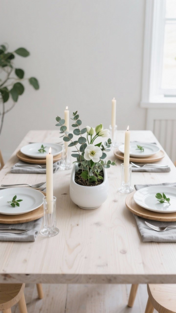 Clean, bright, and impossibly inviting. Start with a pale ash wood table and skip the tablecloth—let the grain shine. Use matte white plates and blonde wood chargers, paired with brushed steel flatware for a quiet sheen.