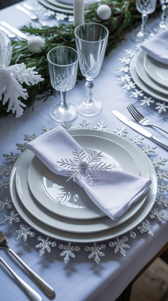 - Use snowflake or frosted details like clear chargers.